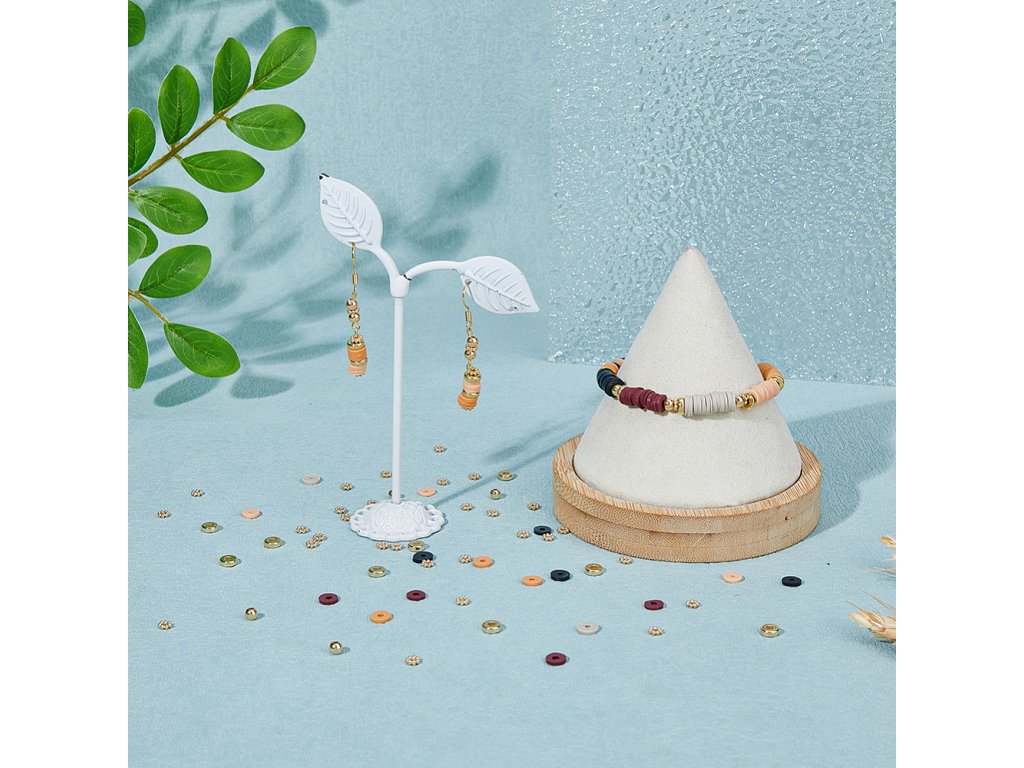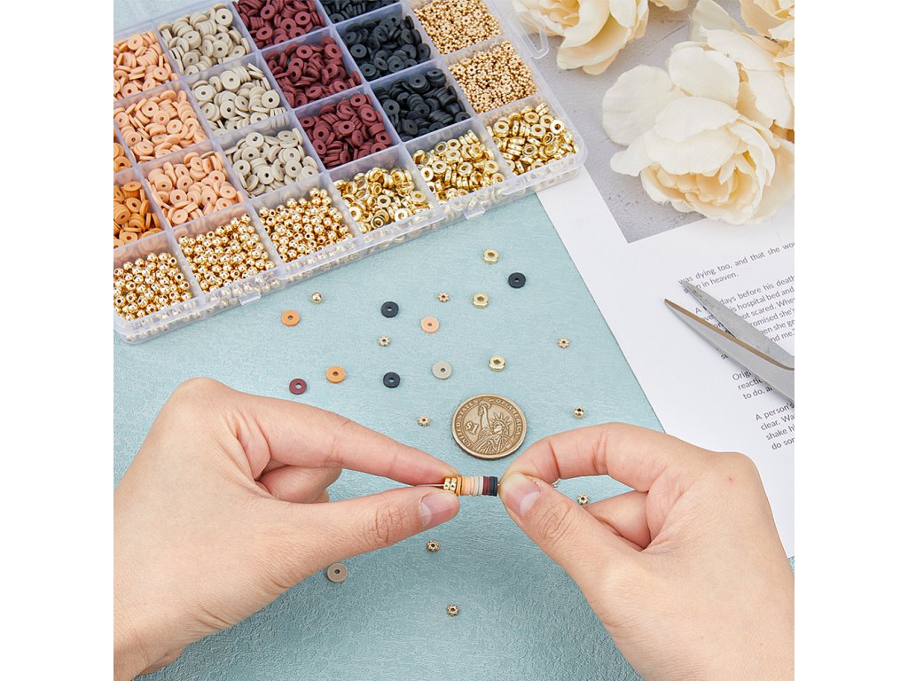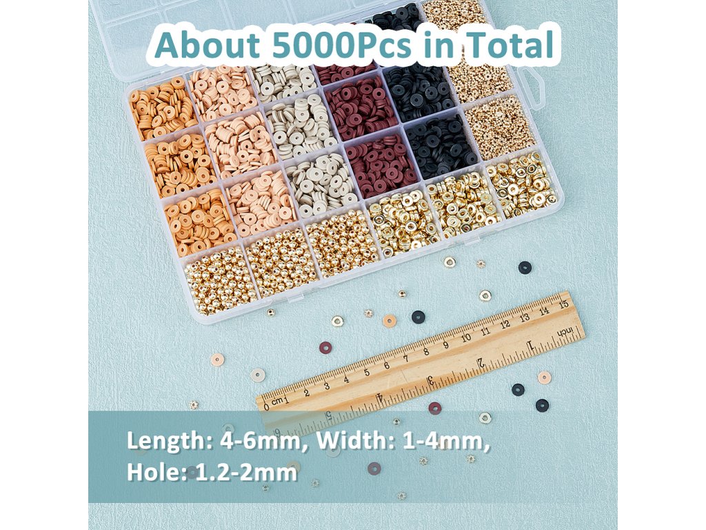 - Polymerové ploché korálky (diskové): cca 6 × 1 mm, otvor 2 mm, 5 barev, přibližně 495 ks/barva, celkem cca 2475 ks