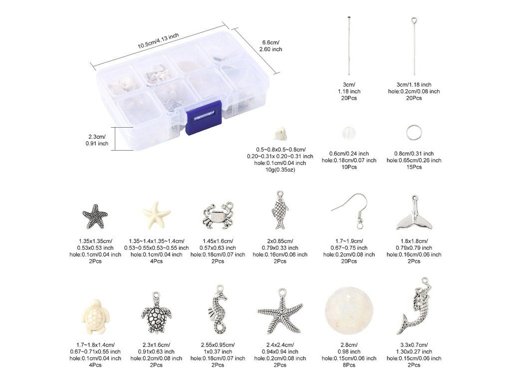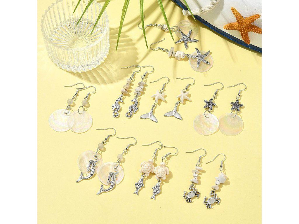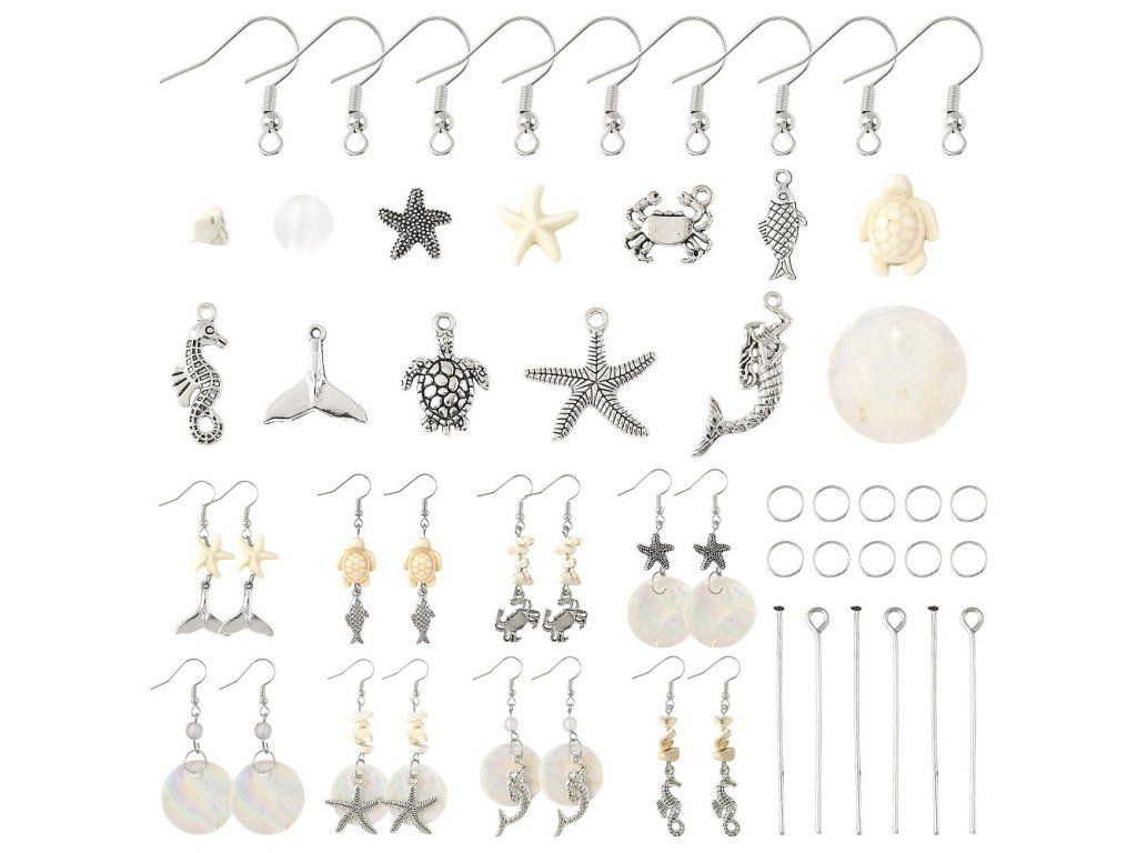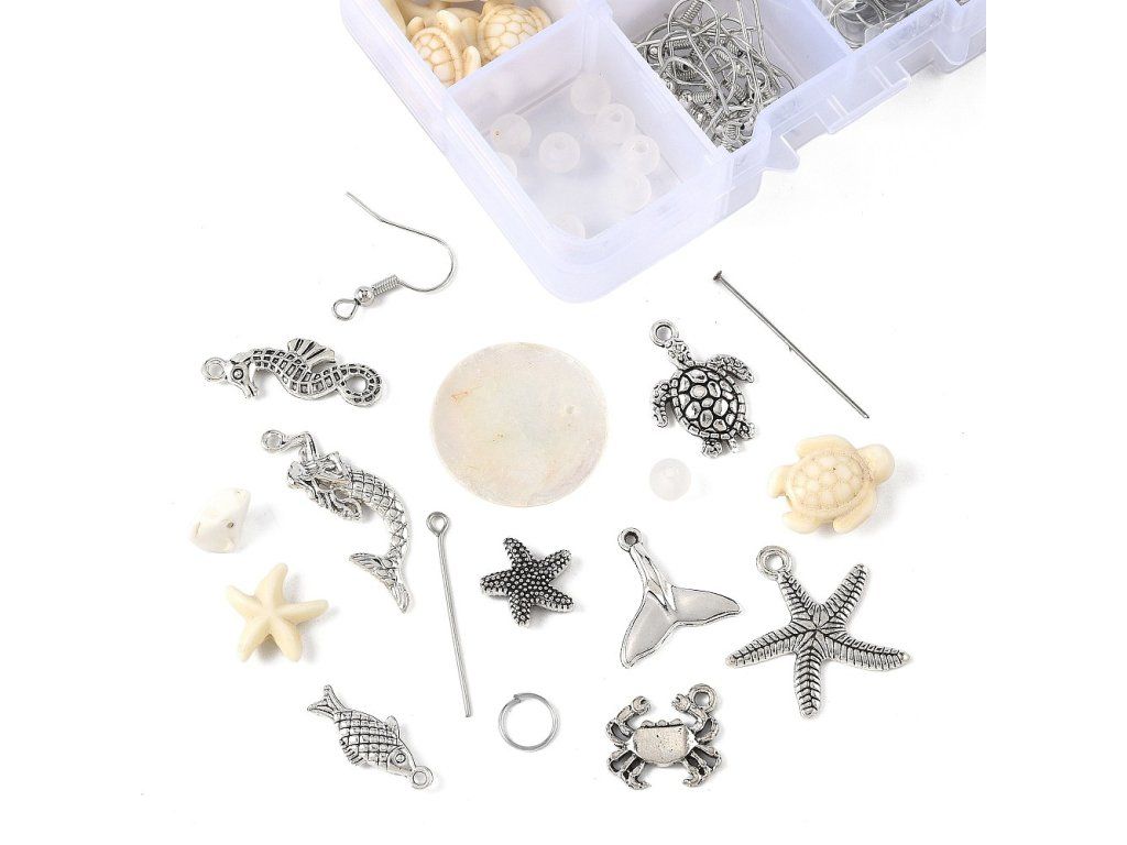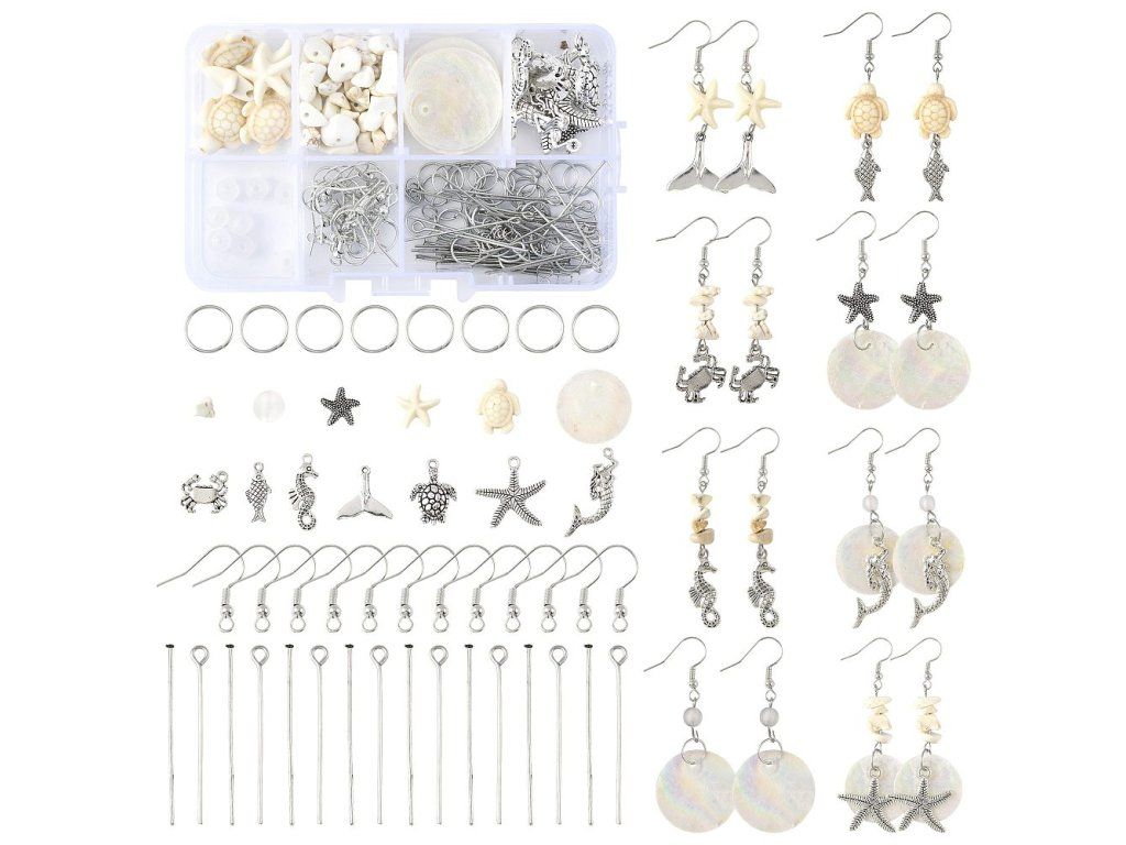 Tato kreativní sada s mořskou tematikou obsahuje vše potřebné pro výrobu vlastních stylových náušnic. Najdete v ní rozmanité akrylové a tyrkysové korálky, přívěsky z mušlí Capiz a kovové komponenty. Sada je ideální pro tvorbu originálních šperků, které skvěle doplní letní outfit nebo poslouží jako jedinečný ručně vyrobený dárek.
