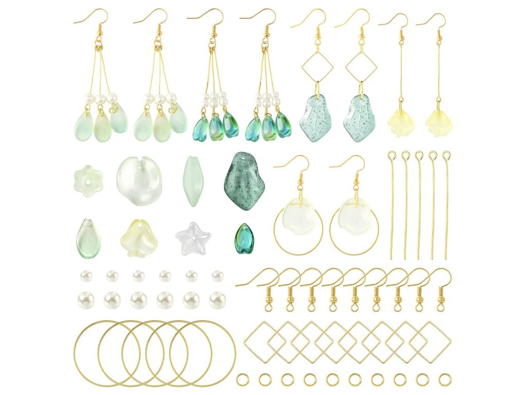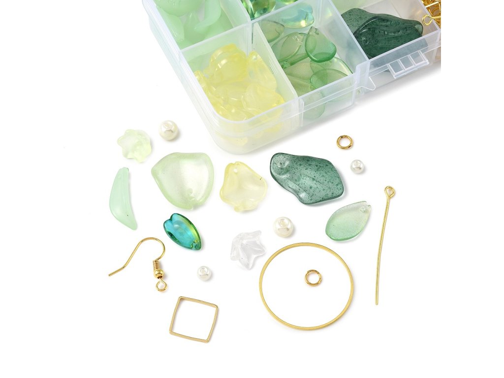 Tato kreativní sada v osvěžujících zelených odstínech je ideální pro každého, kdo si chce vlastnoručně vyrobit originální šperky s motivem květin. Obsahuje bohatý výběr skleněných přívěsků v různých tvarech okvětních lístků a kalichů, které v kombinaci s mosaznými háčky vytvoří elegantní a lehké doplňky.