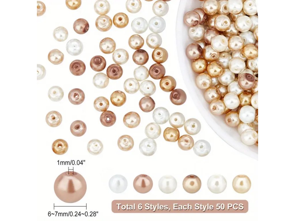 Skleněné voskové perly: cca 6–7 mm v průměru, průvlek: 1 mm, 6 barev, celkem 300 ks