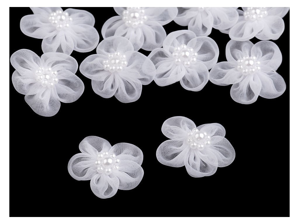 Něžný monofilový květ je velice romantický. V jeho středu jsou našité skleněné perličky s perleťovým leskem.