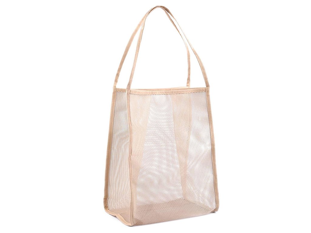 Velká síťovaná taška je lehká a prostorná, s rozšířeným dnem. Má dvě ucha za která se dá nosit v ruce i na rameni. Síťovina je pevná, tašku využijete na nákupy i na pláž.