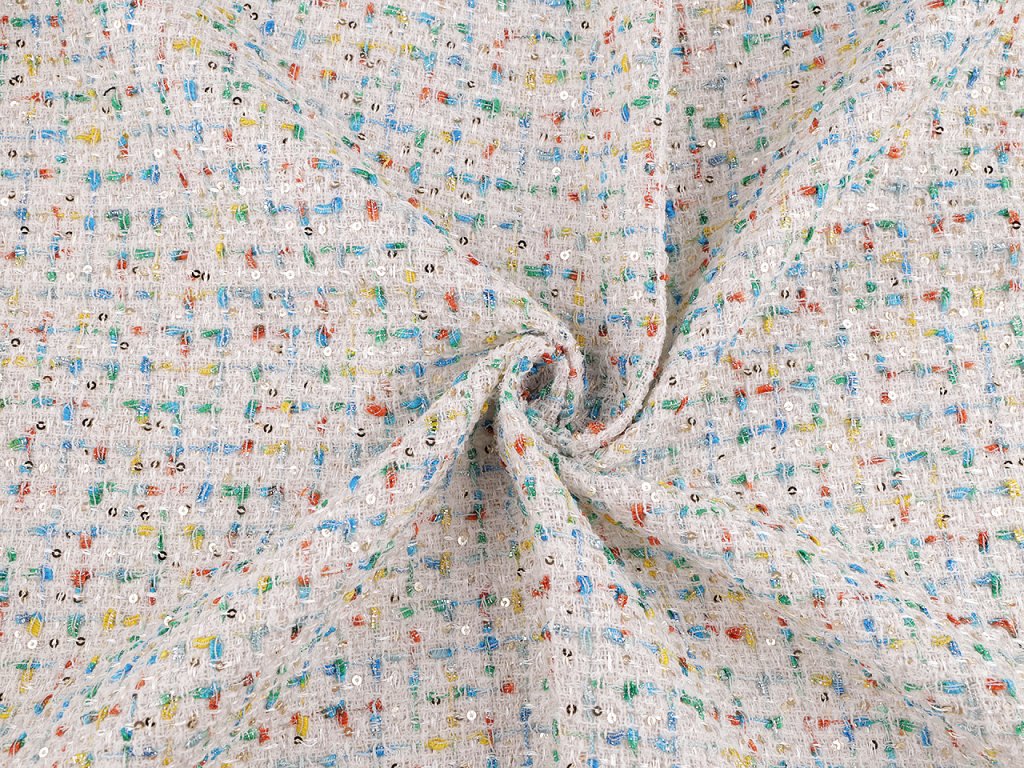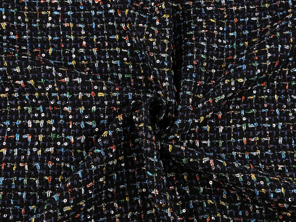Kostýmovka je efektně protkaná barevnými detaily a drobnými flitry. Využijete ji na šití sak, vest, sukní, šatů nebo kostýmových kalhot. Je pevná a měkká, doporučujeme ji podšít podšívkou. Nemačká se.