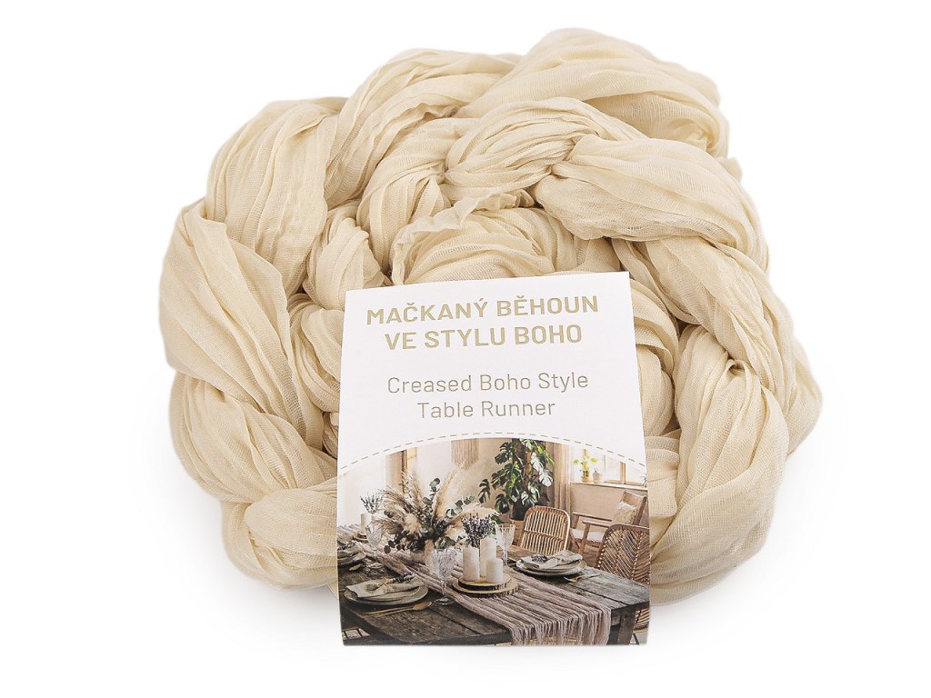 Slavnostní mačkaný běhoun ve stylu boho je elegantní dekorací, která poslouží k ozdobení středové části stolu. Jeho jednoduchý vzhled a průsvitný materiál, v kombinaci s přírodními tóny, dokonale zapadne do atmosféry boho stylu. Kvalitní materiál zajišťuje příjemnou texturu a vzhled, který působí lehce a vzdušně. Využijete ho na různých oslavách a svatbách, kterým dodá harmonickou atmosféru. Může být i ozdobou pro předsvatební hostinu, recepci, party či jiné typy oslav, kde chcete vytvořit nezapomenutelnou atmosféru.