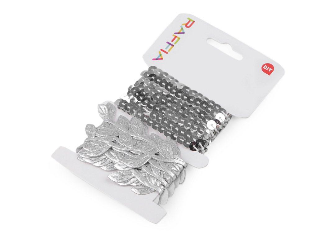 Najdete zde prýmek s lesklými flitry (Ø6 mm) a textilní prýmek s listy. Oba prýmky mají návin 2 m.