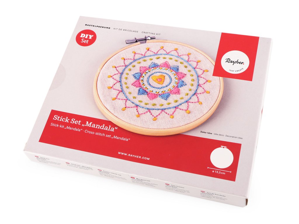 Se sadou na vyšívání vytvoříte zajímavý obrázek mandaly. Vyšívá se na předtištěné plátno pomocí příze mouline.