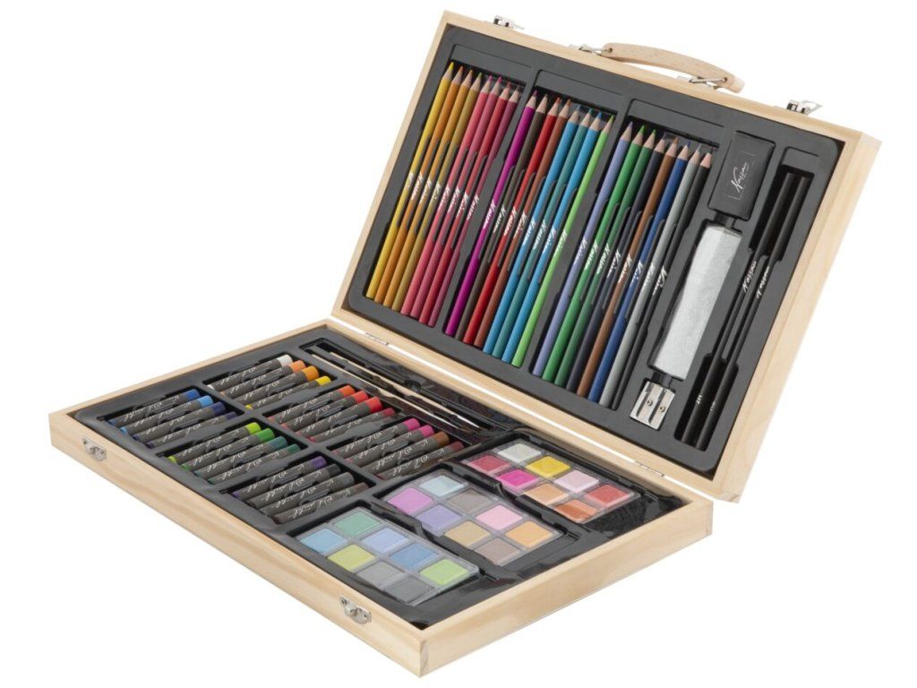 Dřevěný malířský kufr obsahuje 79ks malířských potřeb – pastelky, fixy, vodové barvy, voskovky, pastely.