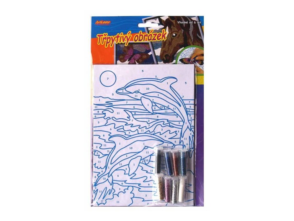 Opatrně odlepte jeden díl předražené folie. Na vzniklou lepivou plochu nasypte třpytky. Postup opakujte na celý obrázek. Sada obsahuje obrázek a 8 tubiček se třpytkami.