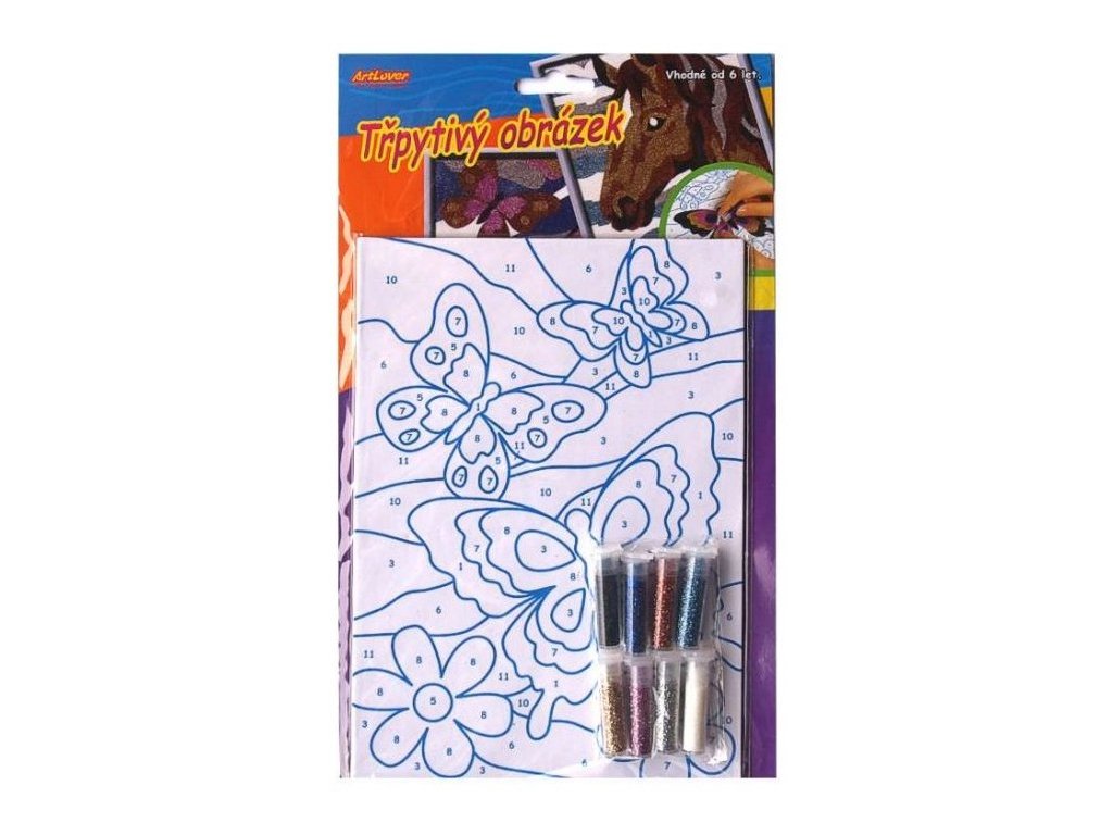Opatrně odlepte jeden díl předražené folie. Na vzniklou lepivou plochu nasypte třpytky. Postup opakujte na celý obrázek. Sada obsahuje obrázek a 8 tubiček se třpytkami.