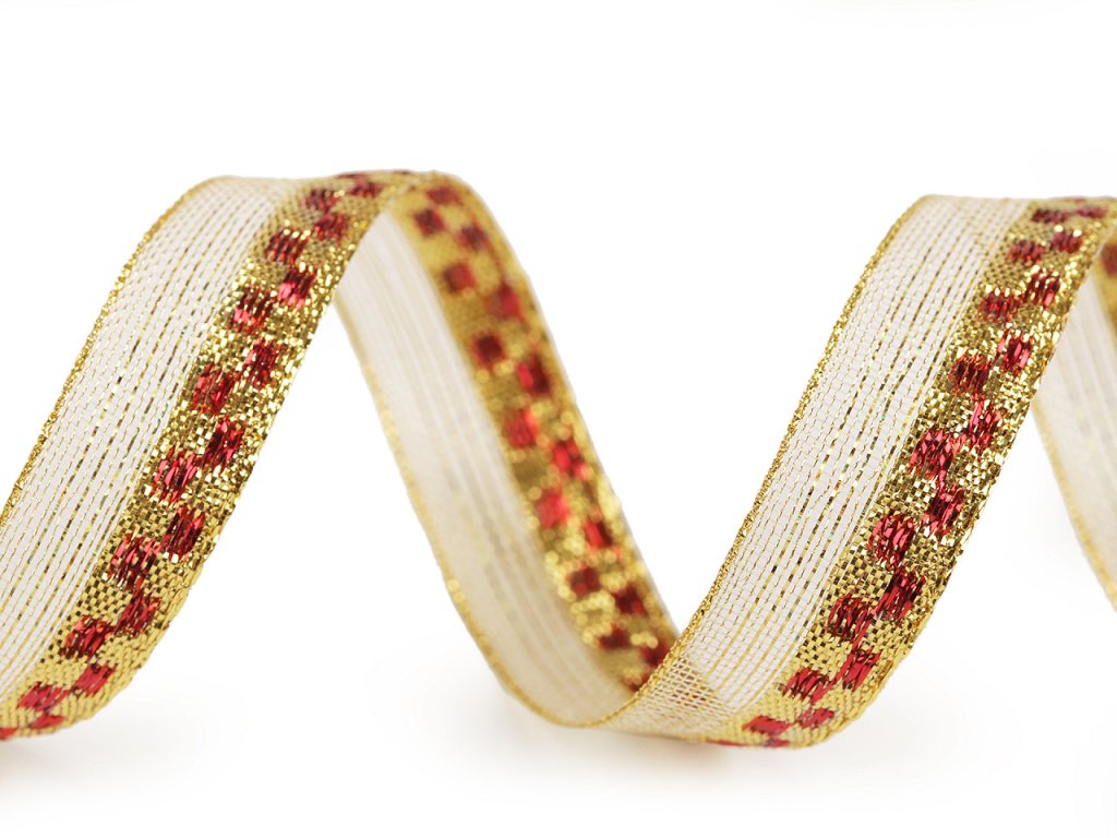 Třpytivou dekorační stuhu zdobí ornamenty z hustě protkaného lurexu. Je měkká, ale přitom pevná, uvázané mašle drží pěkně tvar. Je jednostranná, ale rubová strana je také pěkná.
