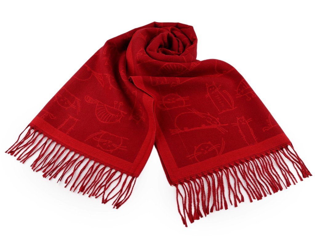 Velký luxusní šátek typu kašmír je ozdobený motivem koček. Je vyrobený z hřejivého materiálu, který je příjemně hebký na dotek. Krásně vás zahřeje v chladném a sychravém počasí. Hodí se ke kabátu, bundě i svetru. Na koncích je zakončený třásněmi.
