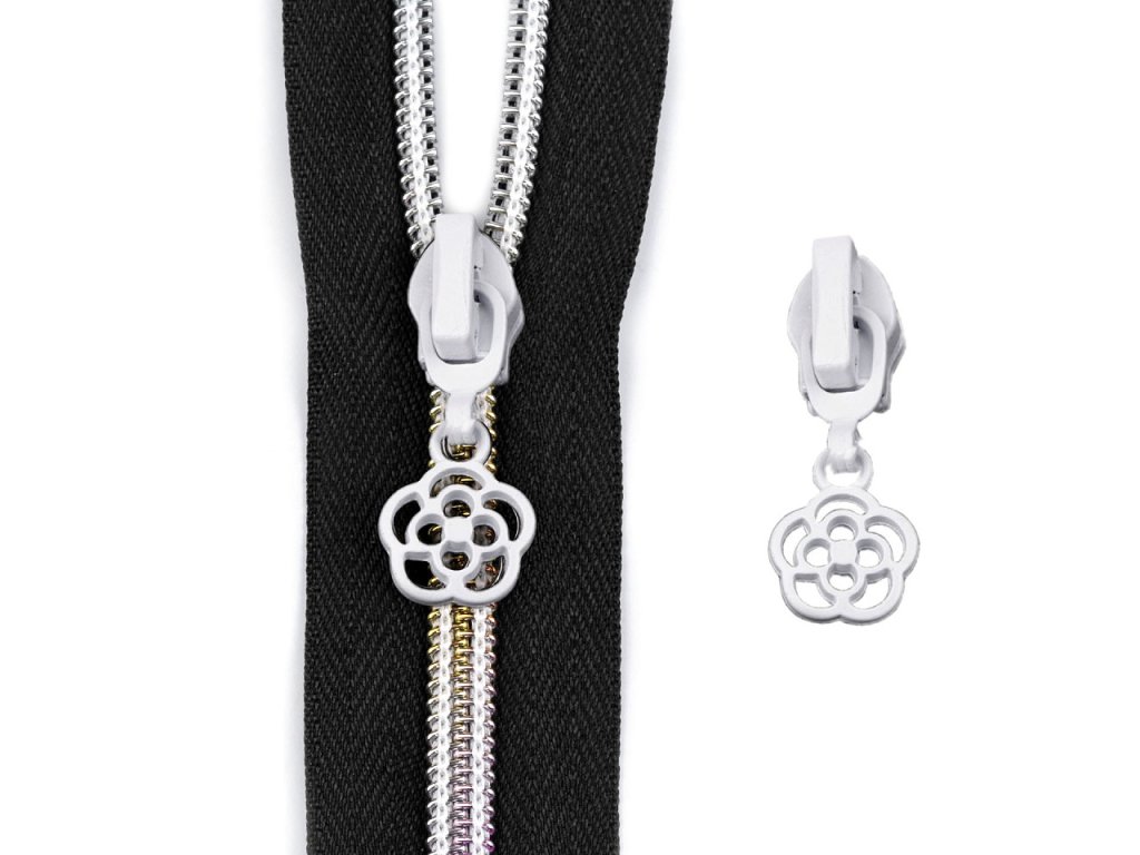 Kovový jezdec s táhlem ve tvaru květu je určený ke spirálovým zipům o šíři 6 mm v metráži, které u nás najdete pod kódy 750503, 790304, 800963[, 750994, 790305, 050714, 750989.]