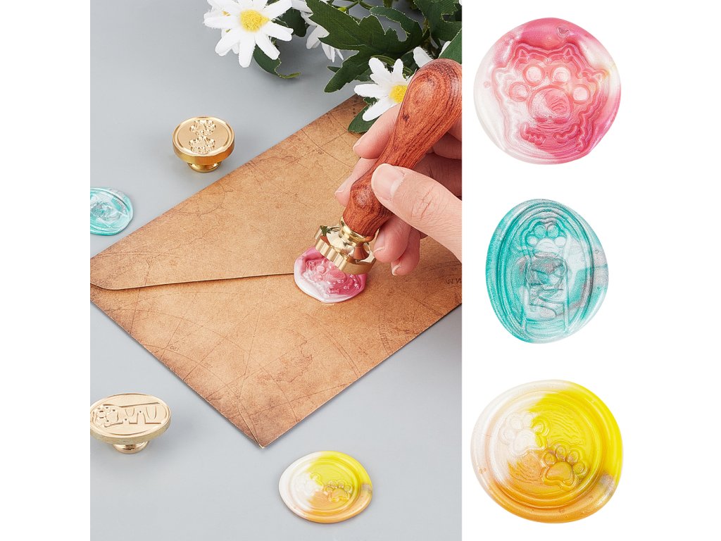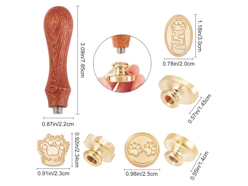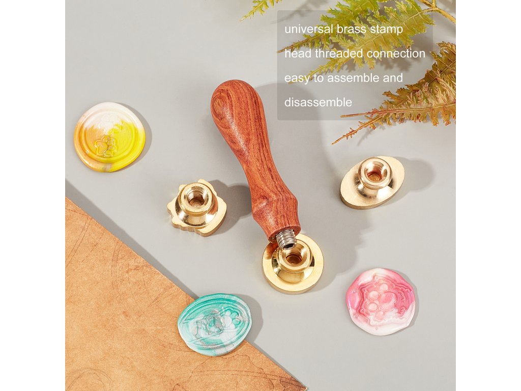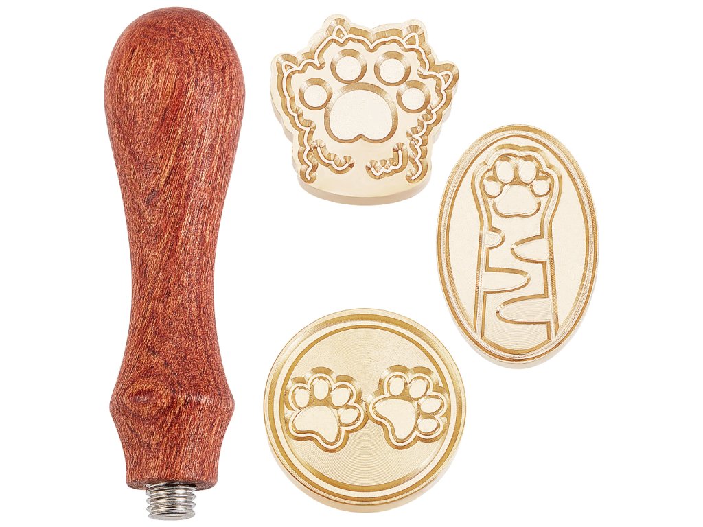 Kovová pečetidla s dřevěnou ručkou pro práci s pečetními vosky, 3 výměnné pečetě.