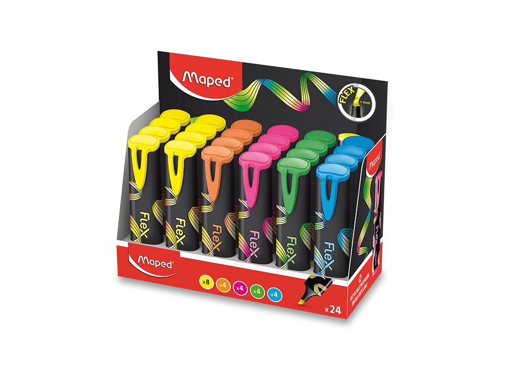 Stojánek 24 ks plochého zvýrazňovače Maped Fluo Peps Flex ve čtyřech barvách. Hrot je pružný a flexibilní pro plynulé psaní.